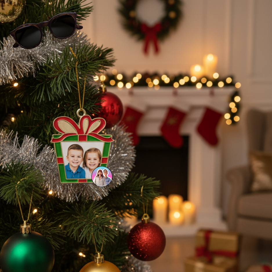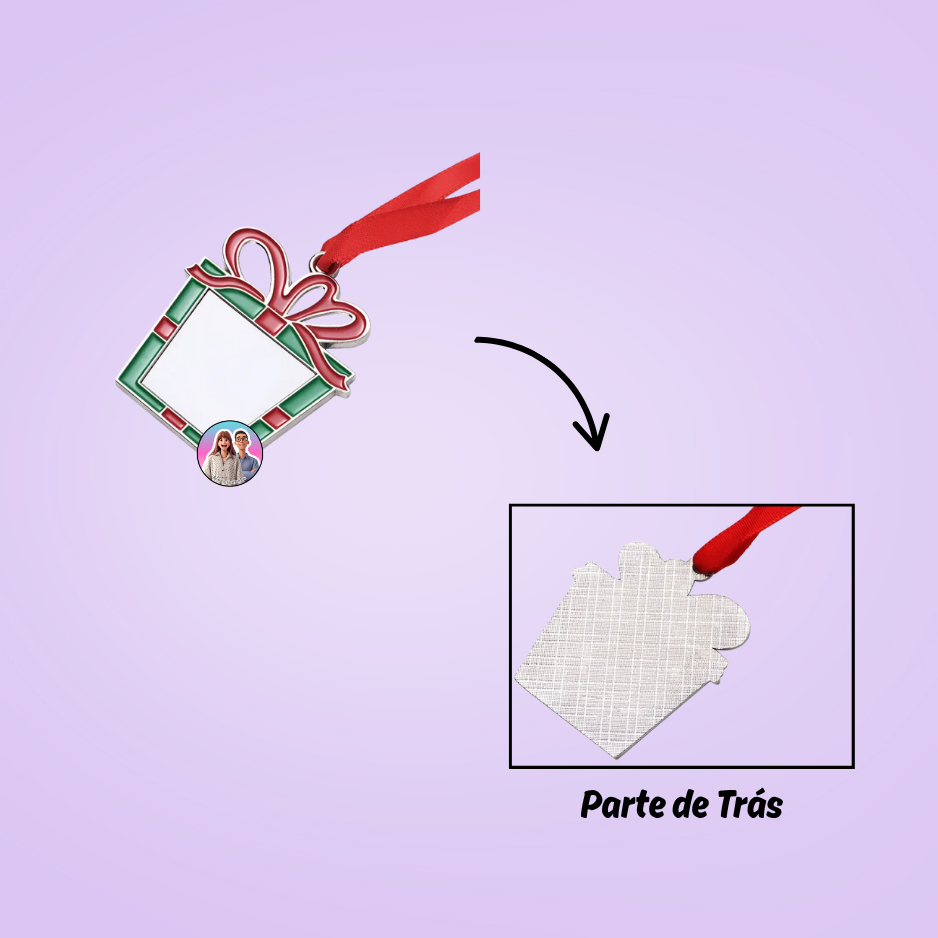 Enfeite de Natal em forma de prenda, personalizável com qualquer foto especial pessoa, casal ou animal.